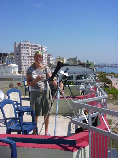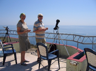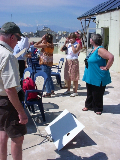 Op het dakterras van het hotel treft iedereen zijn voorbereidingen. De eclipsbrilletjes