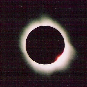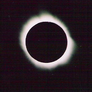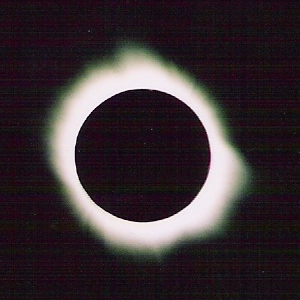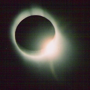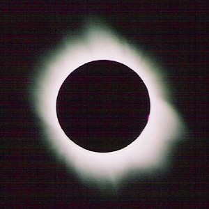 door een prachtige corona. De hemel om de zon heen is loodgrijs. Op het finale moment zijn er heel